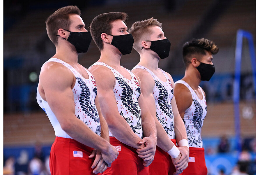Samuel Mikulak of the United States, Brody Malone of the United States, Shane Wiskus of the United States and Yul Moldauer of the United States stand before the Men's Team Qualification at the Ariake Gymnastics Centre, Tokyo, July 24, 2021. They advanced to Monday's team finals, where they placed fifth.